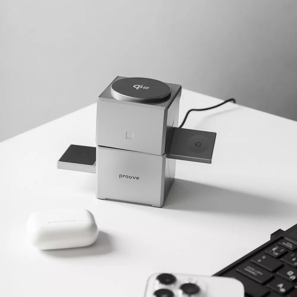 Proove Iron Hide 3in1 — це бездротова зарядна станція нового покоління, яка об'єднує три незалежні зарядні поверхні в одному пристрої з інноваційним дизайном. Модульна конструкція складається в акуратний компактний блок, а в розгорнутому стані перетворюється на повноцінну зарядну платформу.
