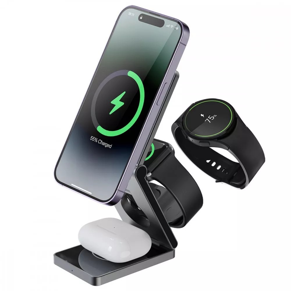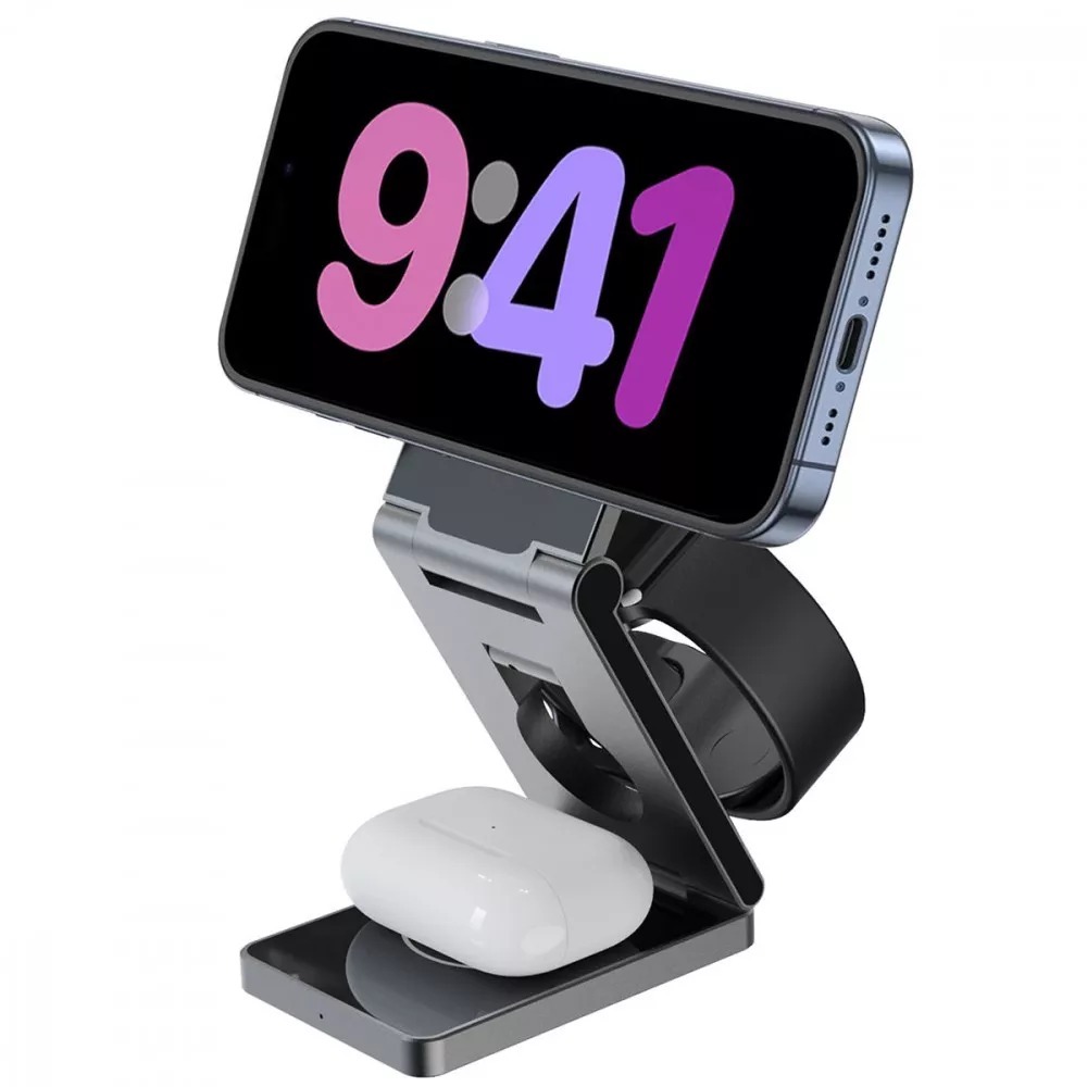 В основі роботи пристрою лежить технологія MagSafe з підтримкою стандарту Qi, що забезпечує надійне магнітне з'єднання та стабільну передачу енергії. Станція оснащена трьома зонами заряджання з чітко розподіленою потужністю: смартфон отримує до 15 Вт, навушники — 5 Вт, а смартгодинник — 3 Вт. Вхідне живлення здійснюється через роз'єм Type-C із параметрами 5V/2А та 9V/3А, що гарантує швидку та ефективну зарядку одразу всіх підключених пристроїв.