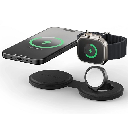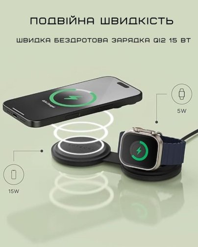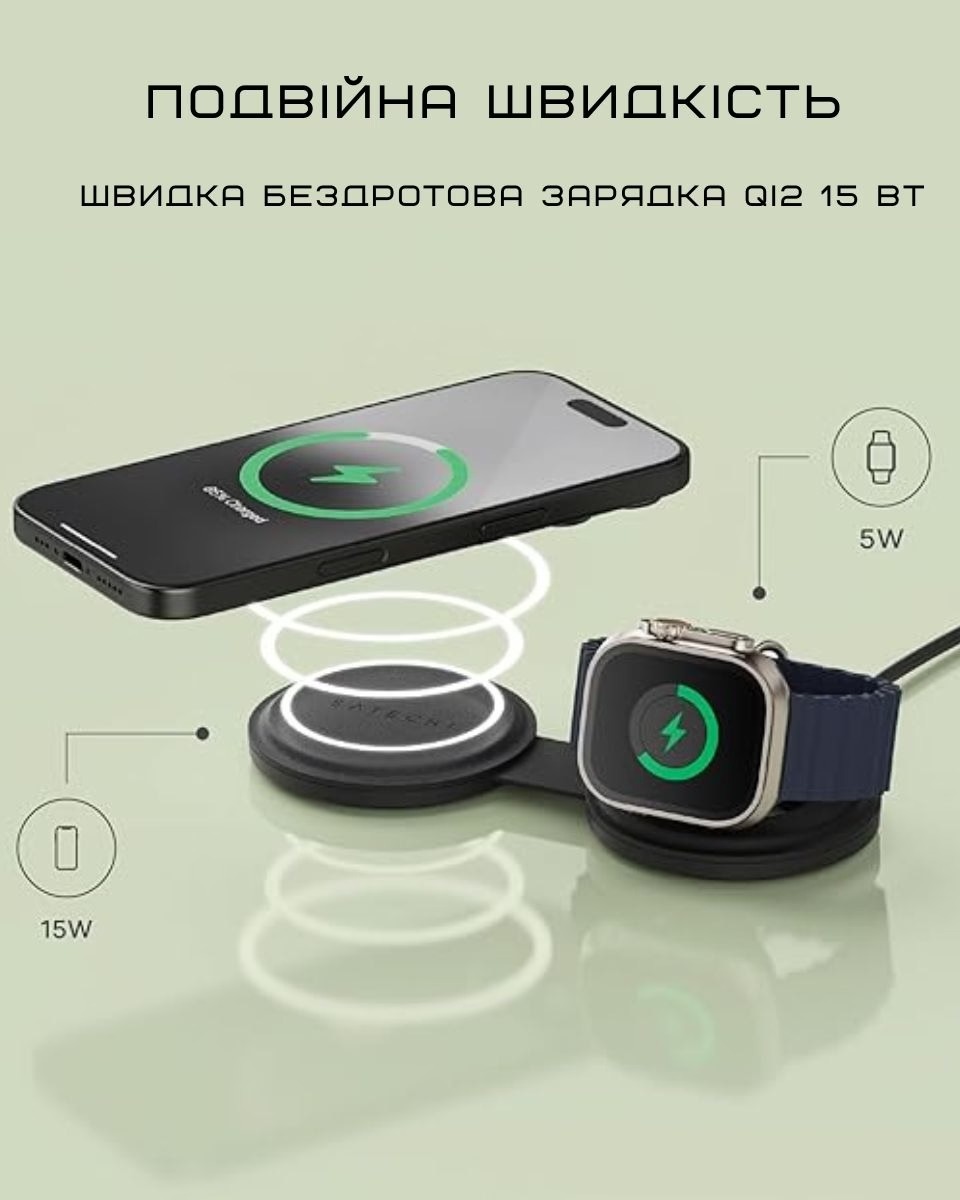 Бездротова зарядна станція Satechi OntheGo 2-in-1 — це портативне та стильне рішення для одночасної зарядки iPhone та Apple Watch без кабелів і зайвого безладу. Завдяки новітній технології Qi2 вона забезпечує магнітне кріплення та швидку бездротову зарядку: до 15 Вт для iPhone та до 5 Вт для Apple Watch. Потужні вбудовані магніти гарантують точне вирівнювання та надійний контакт, дозволяючи швидко відновлювати заряд протягом дня.