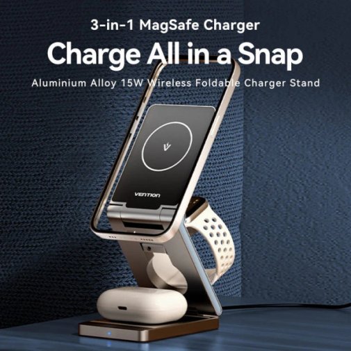 Окрім смартфона, зарядний пристрій підтримує заряджання смарт-годинника (3 Вт) і бездротових навушників (5 Вт). Таким чином, один компактний пристрій замінює одразу кілька зарядок. Загальна потужність — 15 Вт, вага — лише 235 г, а розміри 60 × 92,7 × 22,3 мм роблять його легким і ненав'язливим у будь-якому просторі.