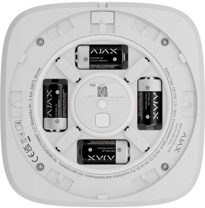 Монтаж виконується професіоналами на стелі (до 3 м) або стіні (до 2,4 м) з урахуванням видимості світлодіодної рамки. Кріпильна панель SmartBracket дозволяє поворот на 90° і фіксацію гвинтами або тимчасово скотчем. Уникайте місць із низьким сигналом Jeweller, біля металевих предметів чи на відстані менше 1 м від ППКП. Підключення до системи здійснюється через QR-код у застосунку Ajax, де задаються параметри пристрою. Батареї забезпечують тривалу автономну роботу, із сповіщенням про розрядження.