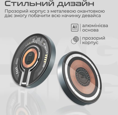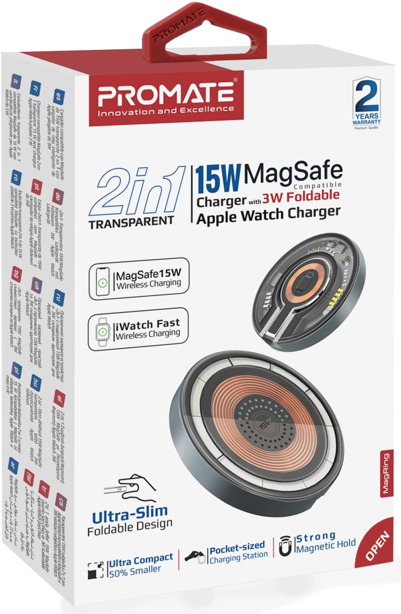 Promate MagRing - стильна та компактна бездротова зарядка з прозорим корпусом і магнітними кріпленнями, яка з легкістю зарядить iPhone та iWatch.