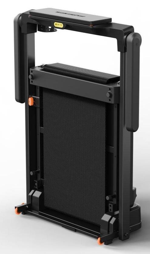 Складана конструкція з вертикальним зберіганням дає змогу швидко прибрати тренажер після тренування. У складеному стані він стоїть вертикально та займає мінімум місця — це практичне рішення для спалень, балконів або невеликих квартир. Завдяки тонкому профілю і вбудованим роликам доріжку легко переміщати між кімнатами, а маса 38,4 кг робить її достатньо стабільною під час використання.