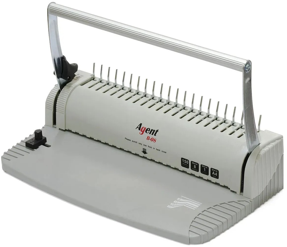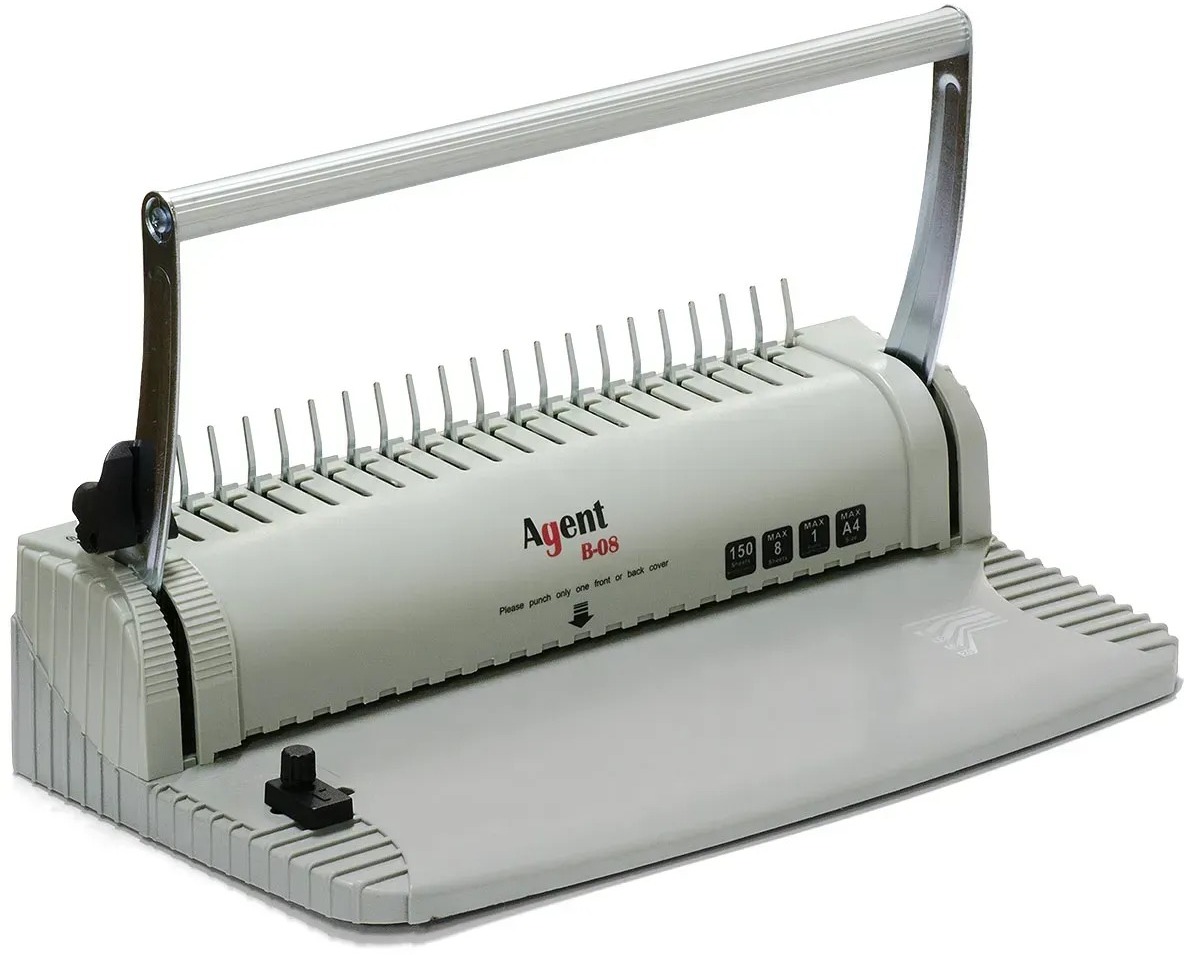 B-08 - механічний біндер для переплетення від бренду Agent. Це модель для використання у великих офісах та копі-центрах. Переплетення з пластиковою пружиною стійке до механічних пошкоджень та забезпечує простоту виробничого процесу.