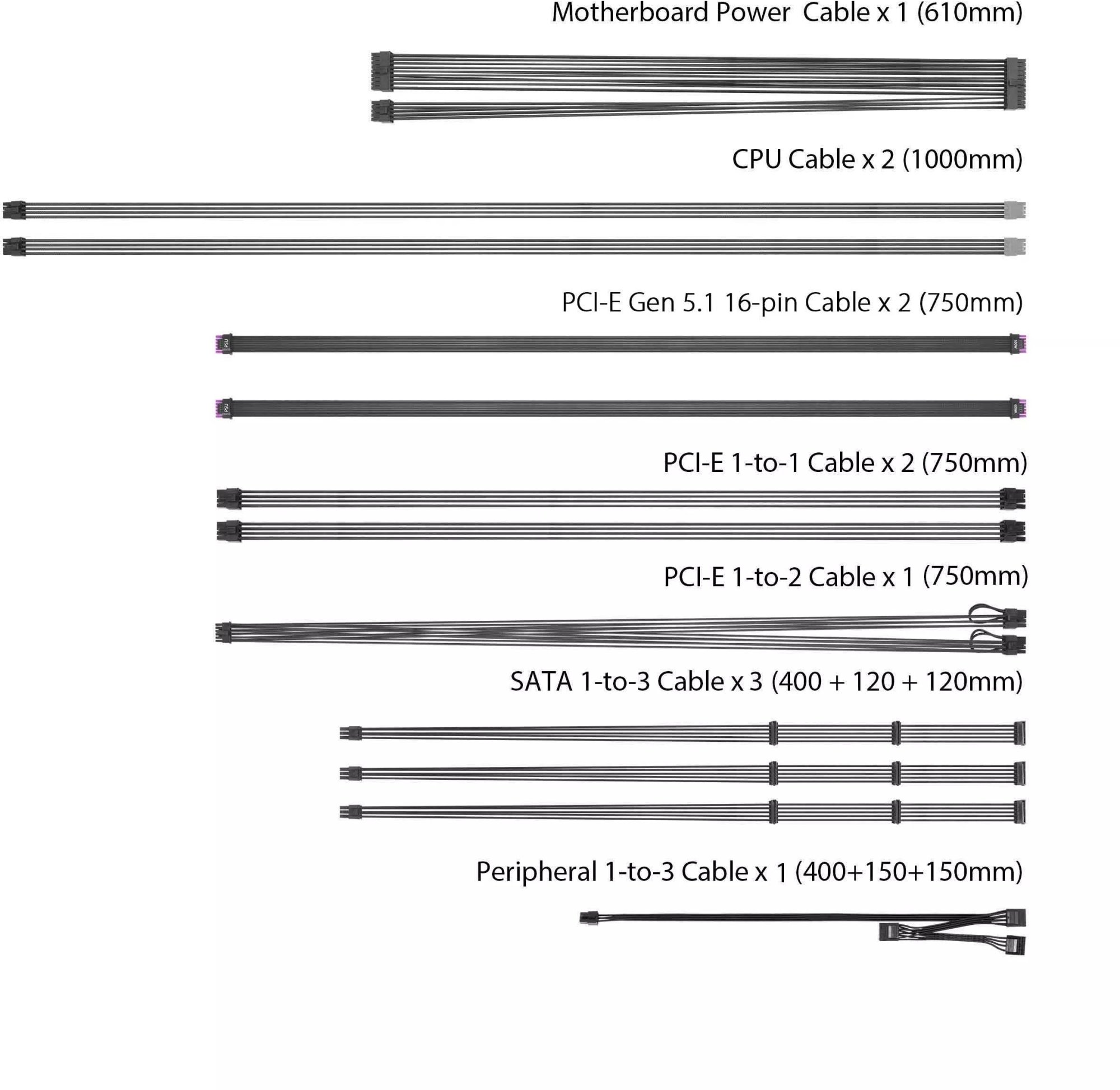 PCIe-конектори оснащені золотими контактами з високопродуктивної міді, що знижує температуру на 12V-2x6 до 10 °C, покращує ефективність та довговічність. Роз’єми для CPU та PCIe мають унікальний дизайн з кліпсами та відмінними кольорами для легкого та безпомилкового підключення. Завдяки повній сумісності з ATX 3.1 та PCIe 5.1, 80 PLUS Platinum сертифікації та преміальним компонентам забезпечується виняткова стабільність напруги, висока ефективність та довговічність.
