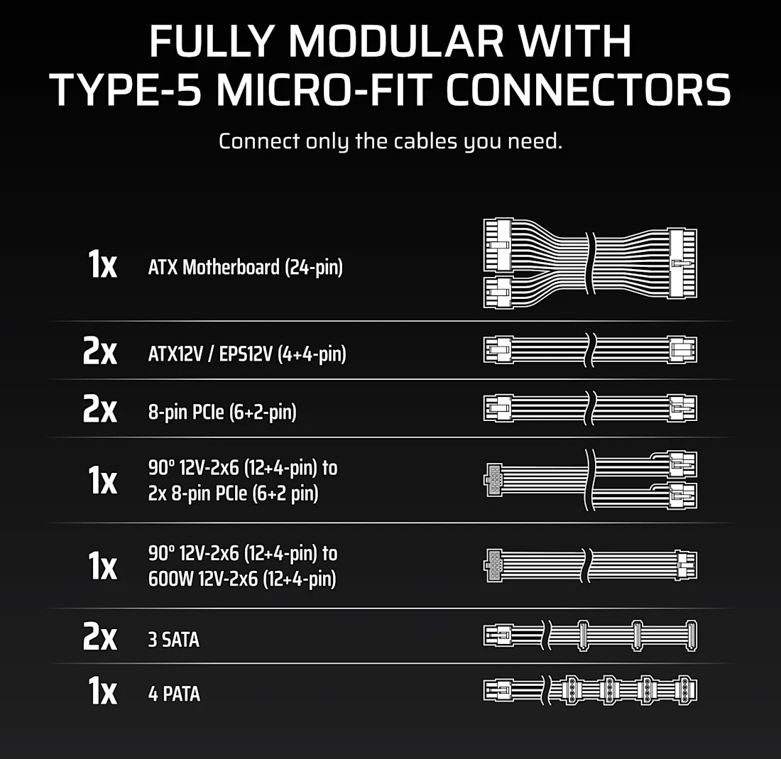 Тихий 140-мм вентилятор працює практично безшумно — на низьких навантаженнях взагалі зупиняється (Zero RPM mode). Повністю модульний дизайн з Type-5 Gen 5 кабелями (включаючи рідний 12V-2×6 для RTX 50-серії) дозволяє підключати тільки те, що потрібно, без зайвих дротів у корпусі.