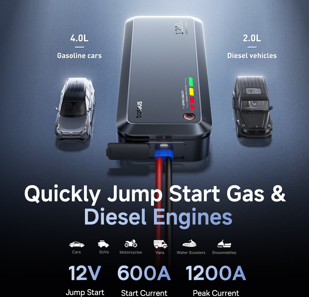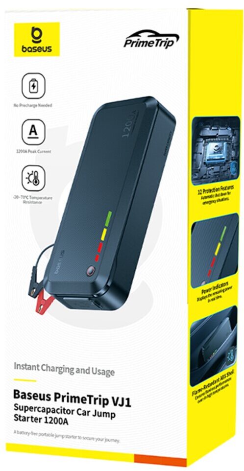 Пристрій генерує піковий струм до 1200 А та пусковий струм 600 А, що дозволяє запускати бензинові двигуни об’ємом до 4,0 л або дизельні до 2,5 л. Це робить його ідеальним для широкого спектра автомобілів, від компактних міських машин до більших позашляховиків. З’єднання через роз’єми-«крокодили» забезпечує просте та безпечне підключення до автомобільної мережі. Baseus PrimeTrip VJ1 оснащений інтерфейсом Type-C для зручного заряджання та індикатором рівня заряду.