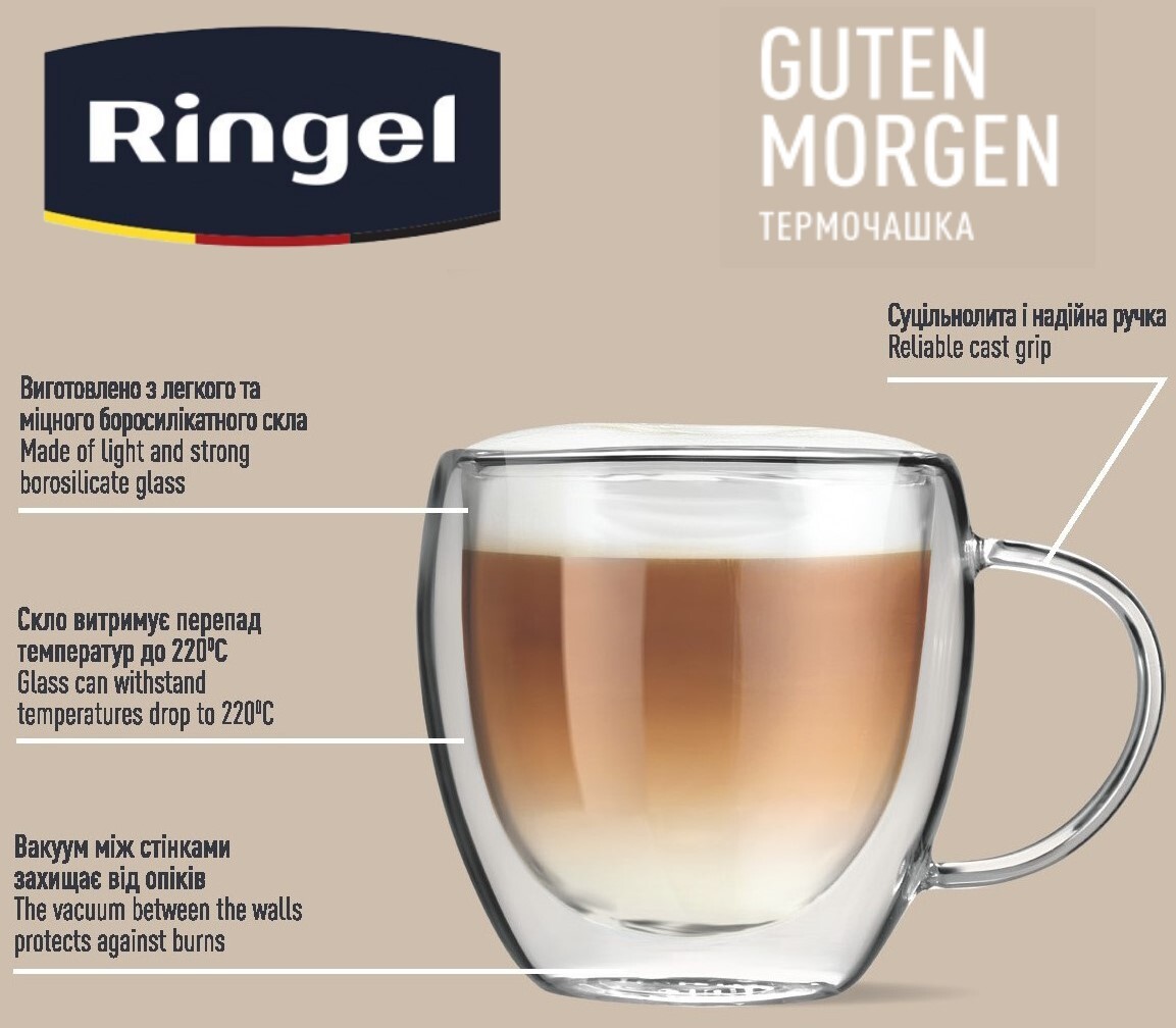 Конструкція чашки з подвійними стінками дозволяє зовнішнім стінкам не нагріватися. І ви можете брати склянку Guten Morgen від RINGEL без побоювань обпектися з гарячим напоєм відразу.