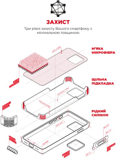 При виготовленні чохла використовувалися преміальні матеріали – Liquid silicone, з Soft Touch покриттям. М'яка підкладка з преміальної мікрофібри надійно захистить ваш гаджет від подряпин, бруду та пилу. Чохол має ребра жорсткості, таким чином телефон захищений з усіх боків. Додатковою перевагою є наявність виступаючих бортів над дисплеєм та наявність додаткової пластикової рамки над задньою камерою для додаткового захисту. У панелі передбачені всі необхідні вирізи та кнопки. Також аксесуар не заважає використанню портів та інтерфейсів пристрою.