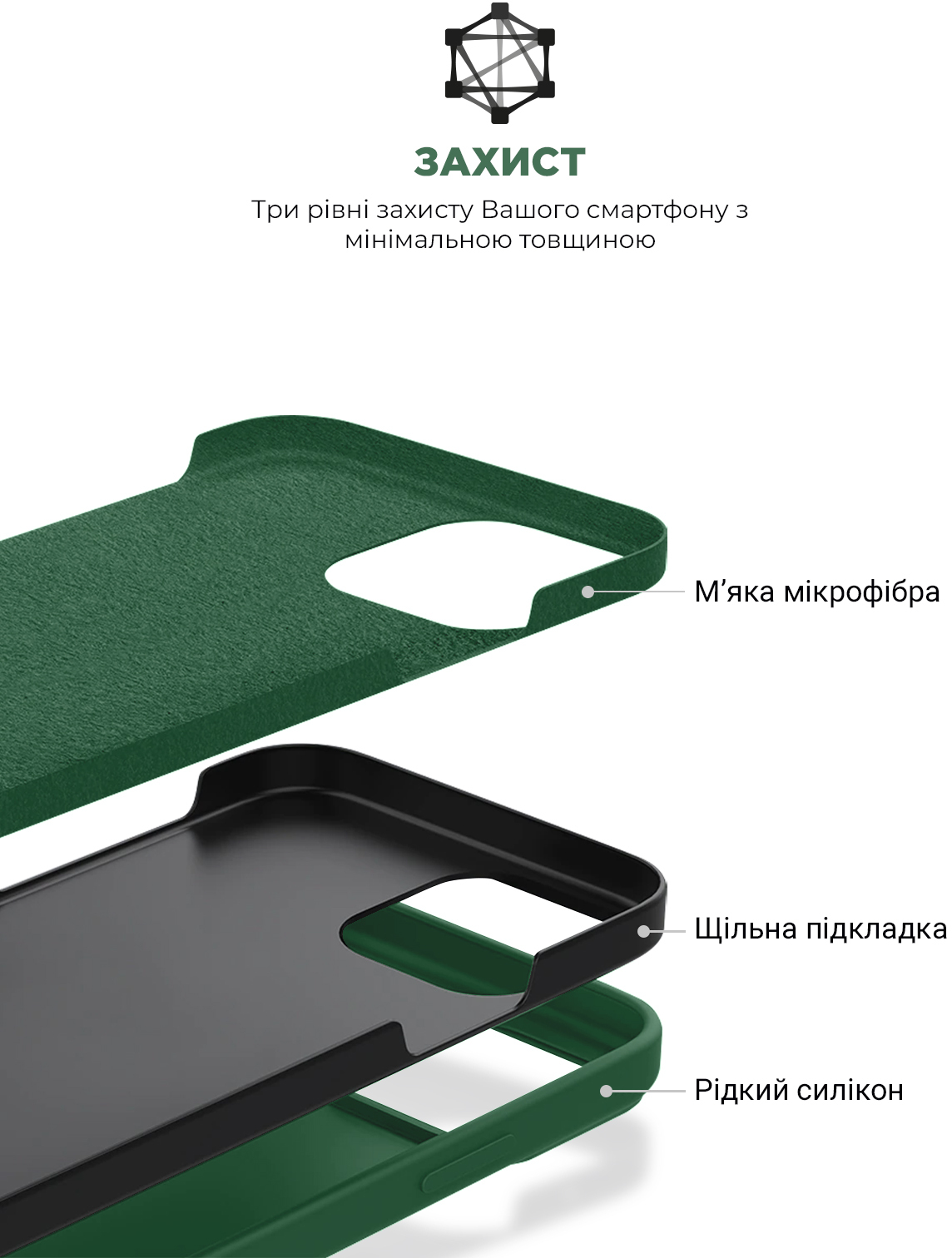 • Преміальні матеріали чохла – Liquid silicone, з Soft Touch покриттям;