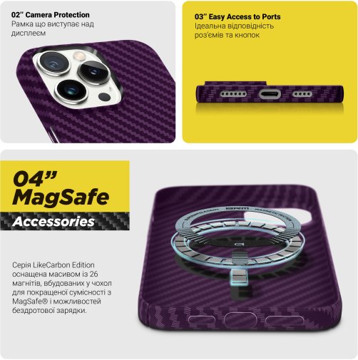 Серія LikeCarbon Edition оснащена масивом із 26 магнітів, вбудованих у чохол для покращеної сумісності з MagSafe і можливостей бездротової зарядки. Особливості: