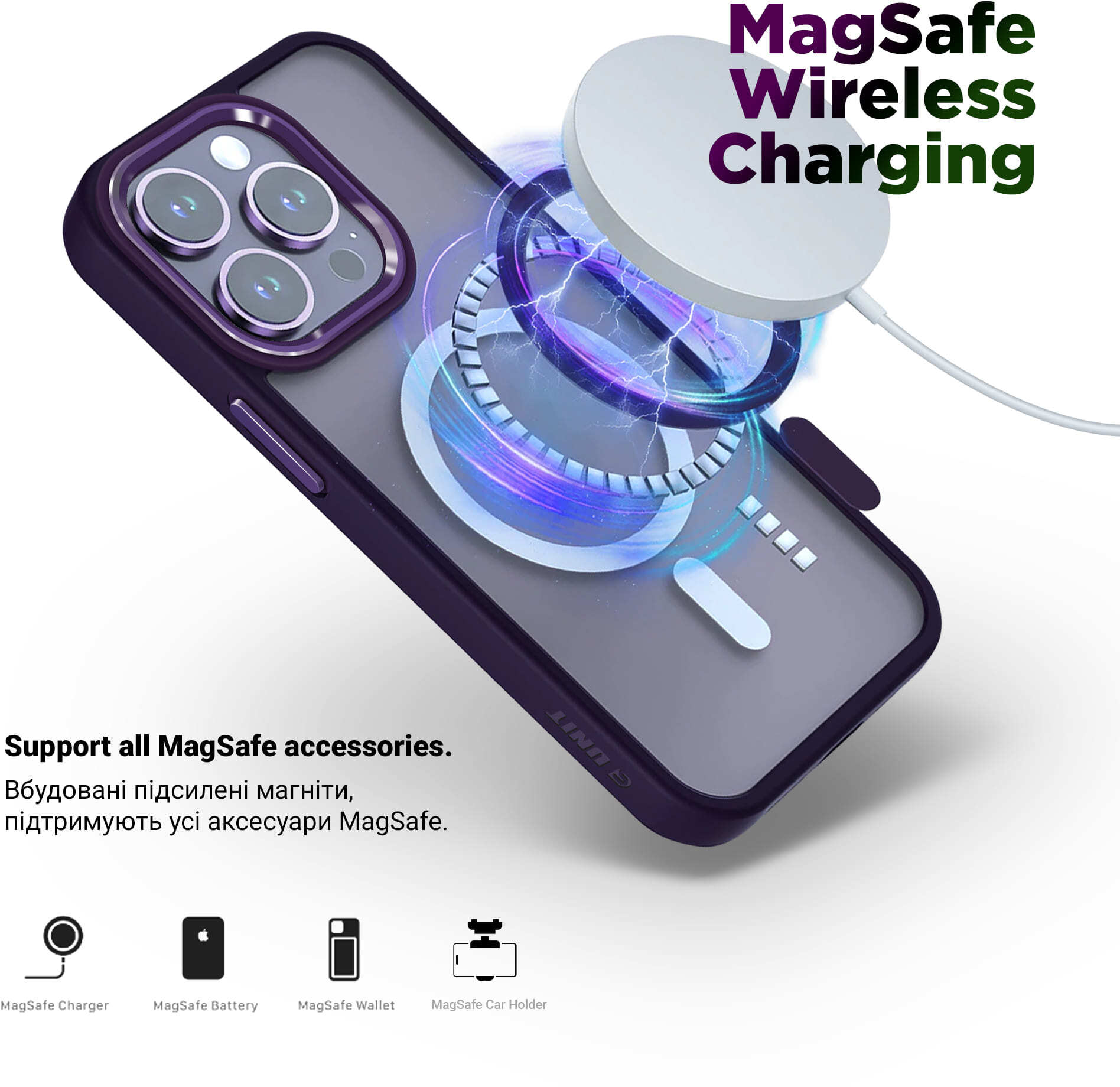 Тип чохла: НакладкаПідтримка MagSafe: ТакМатеріал корпусу: Пластик, ПоліуретанОсновний колір: Фіолетовий