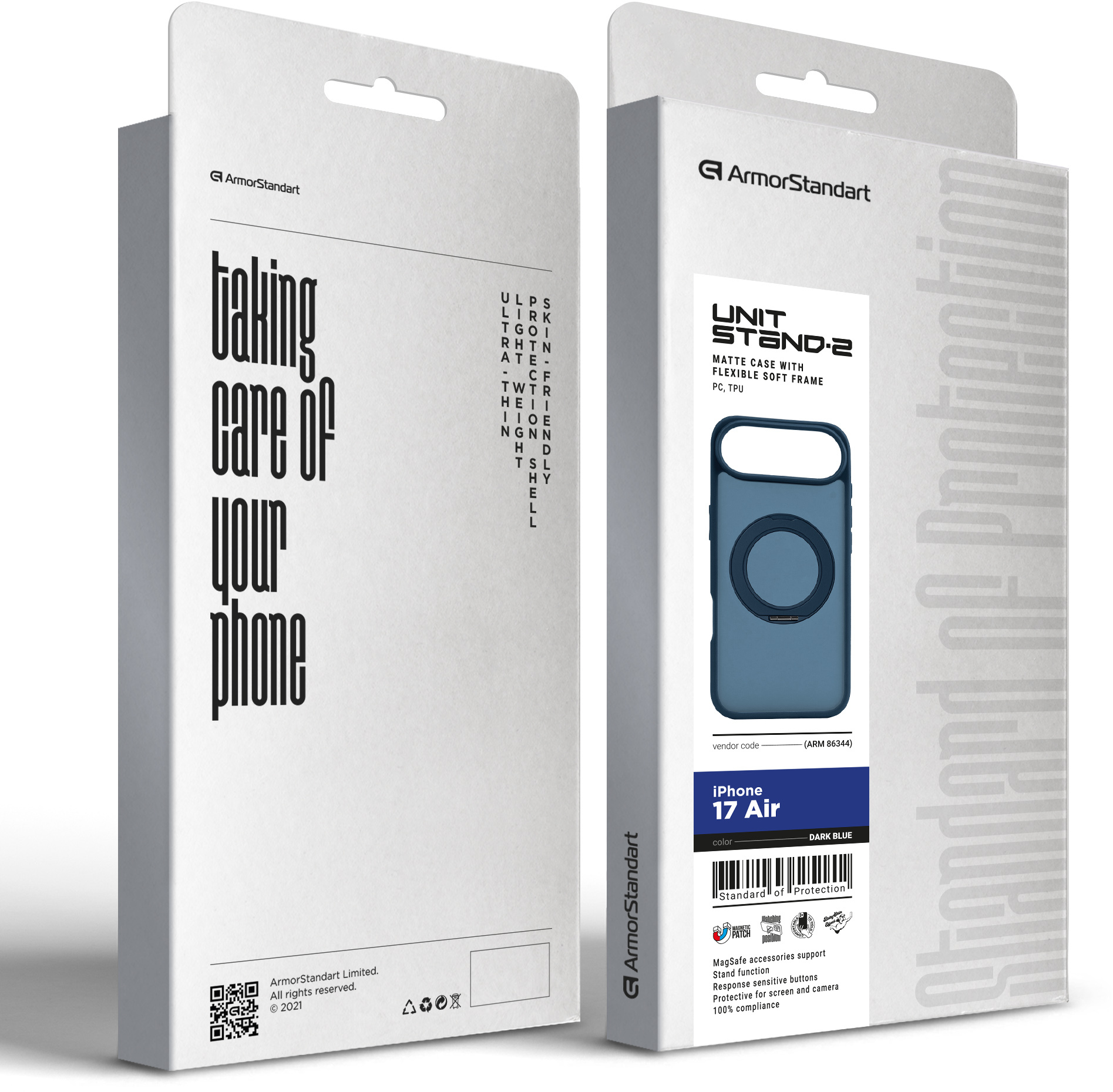 ArmorStandart Unit Stand2 — захисний чохол для Apple iPhone з вбудованою поворотною підставкою та магнітною сумісністю. Модель розрахована на щоденну експлуатацію, де важливі стабільне утримання смартфона, можливість фіксації під кутом і збереження повної функціональності пристрою.