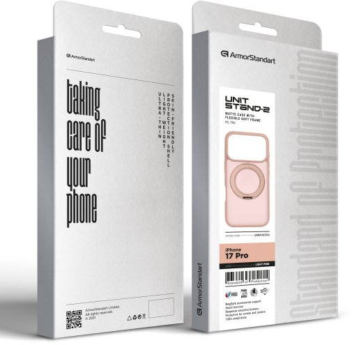 ArmorStandart Unit Stand2 — захисний чохол для Apple iPhone з вбудованою поворотною підставкою та магнітною сумісністю. Модель розрахована на щоденну експлуатацію, де важливі стабільне утримання смартфона, можливість фіксації під кутом і збереження повної функціональності пристрою.