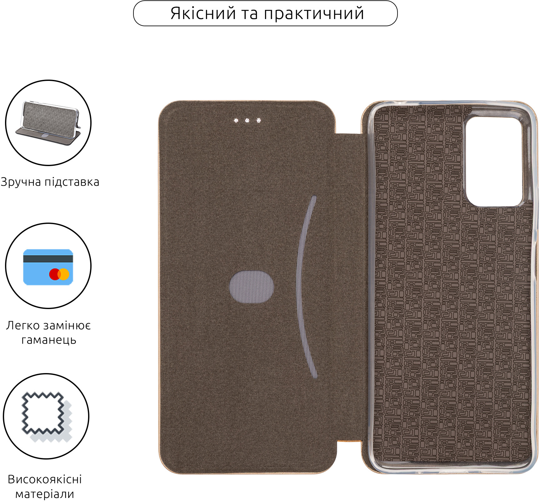 Тип чохла: КнижкаМатеріал корпусу: Поліуретан, Штучна шкіраОсновний колір: Золотий