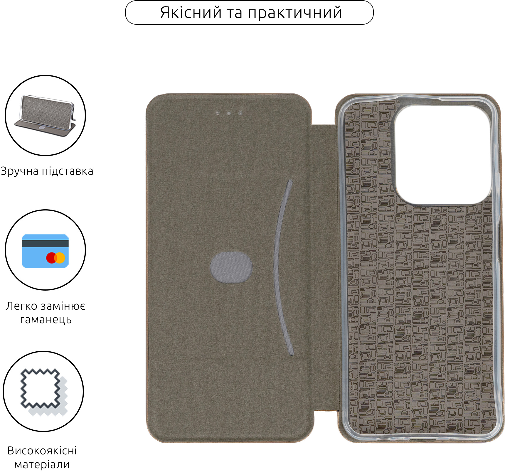 Тип чохла: КнижкаМатеріал корпусу: Поліуретан, Штучна шкіраОсновний колір: Золотий