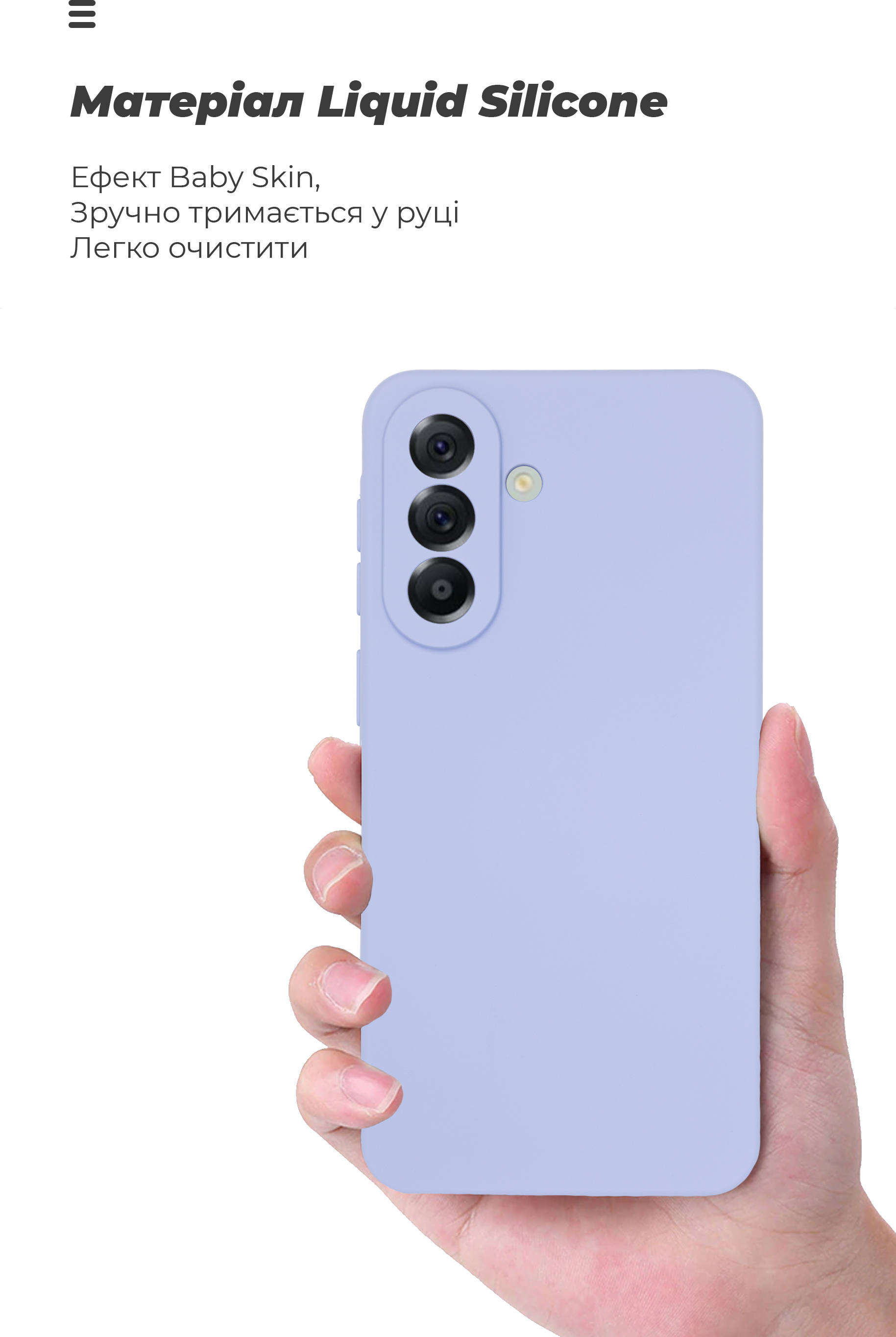 Накладка легко надівається на смартфон завдяки розтягувальним бортикам, які також додатково захищають, виступаючи над поверхнею дисплея й камери. В чохлі передбачені всі необхідні вирізи та кнопки. Він сумісний з усіма типами захисних стекол.
