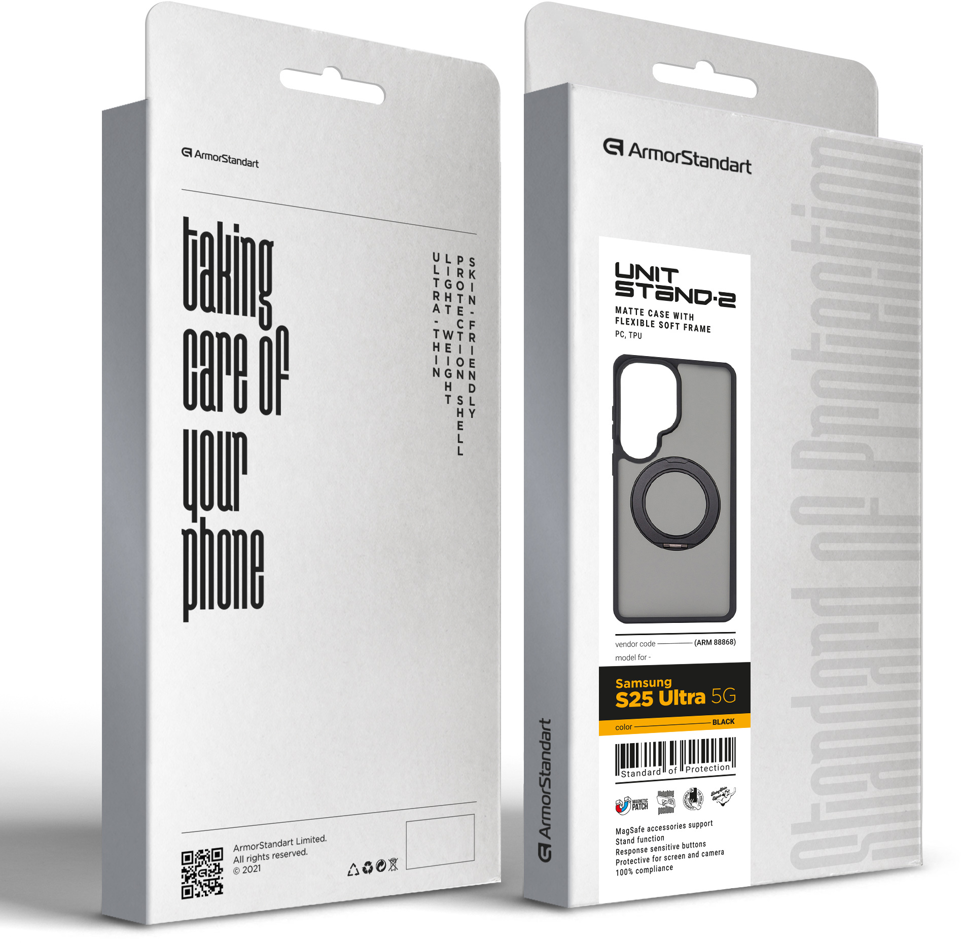 ArmorStandart Unit Stand2 — захисний чохол для Samsung з вбудованою поворотною підставкою та магнітною сумісністю. Модель розрахована на щоденну експлуатацію, де важливі стабільне утримання смартфона, можливість фіксації під кутом і збереження повної функціональності пристрою.