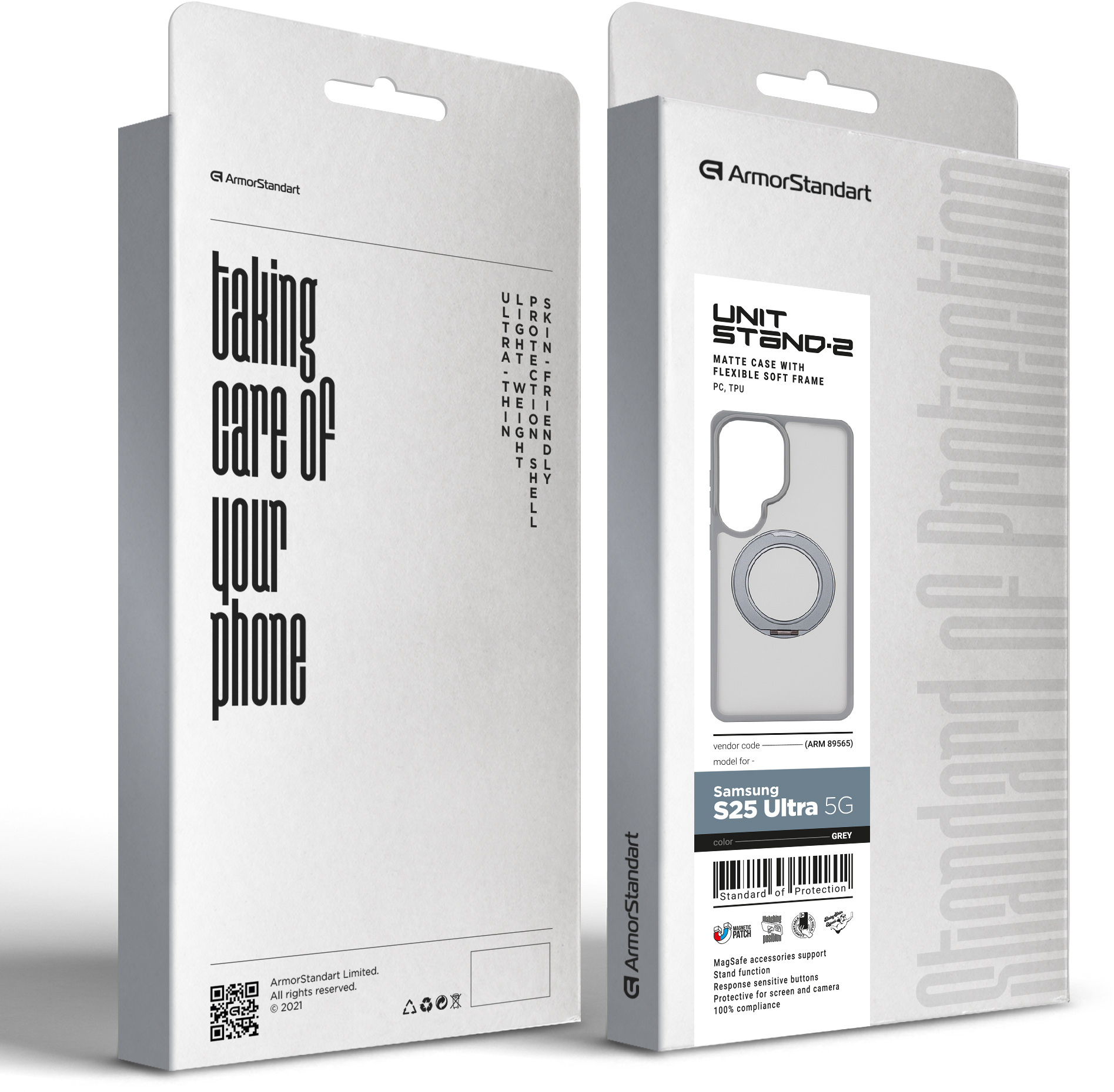 ArmorStandart Unit Stand2 — захисний чохол для Samsung з вбудованою поворотною підставкою та магнітною сумісністю. Модель розрахована на щоденну експлуатацію, де важливі стабільне утримання смартфона, можливість фіксації під кутом і збереження повної функціональності пристрою.