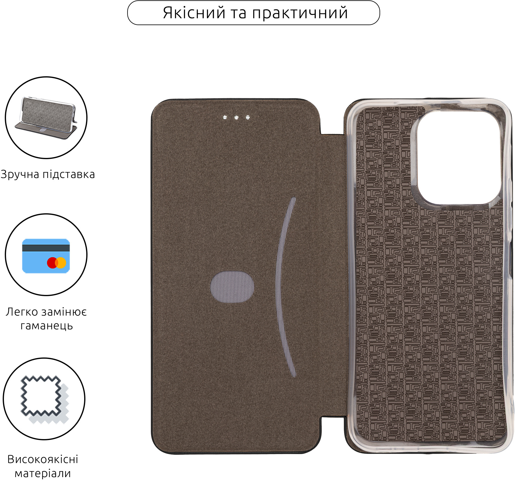 Тип чохла: КнижкаМатеріал корпусу: Поліуретан, Штучна шкіраОсновний колір: Чорний