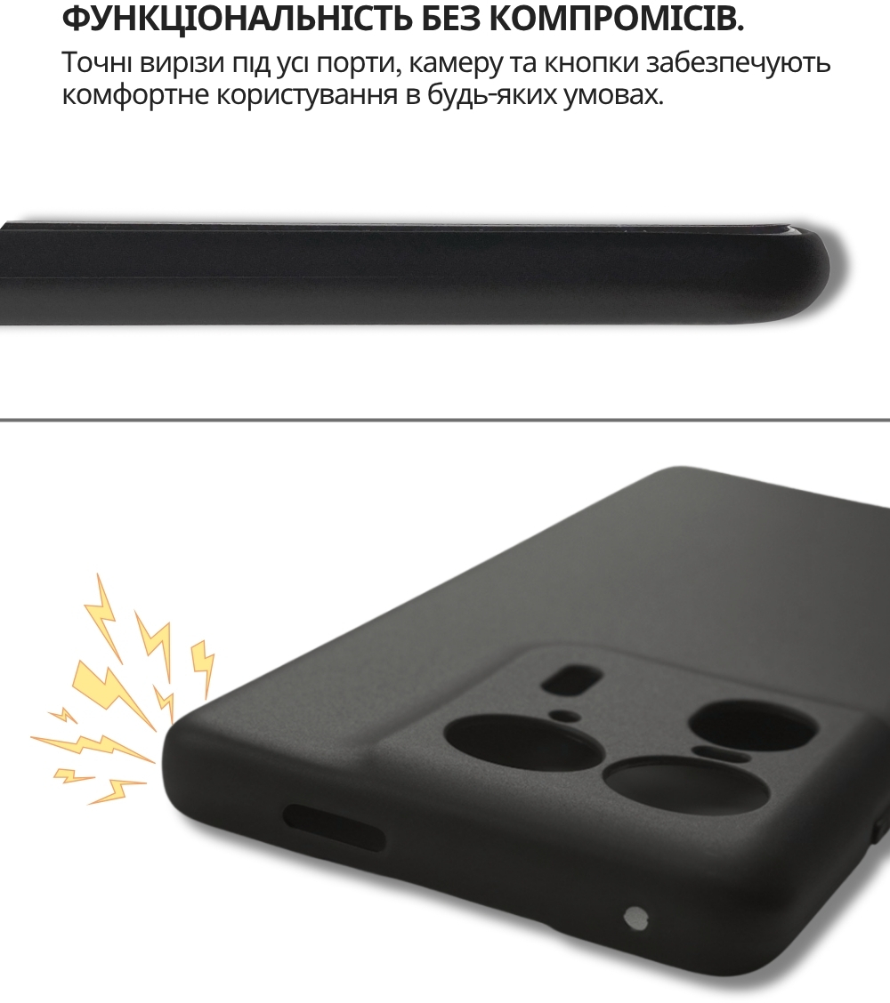 Чохол легко встановлюється, щільно прилягає до поверхні смартфона, не залишаючи повітряних зазорів, які могли б накопичувати пил, бруд або вологу. Легкий і непомітний, він не додає зайвого об'єму чи ваги вашому пристрою, забезпечуючи надійний захист від ударів, пошкоджень і вологи.