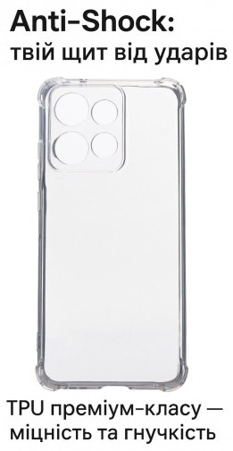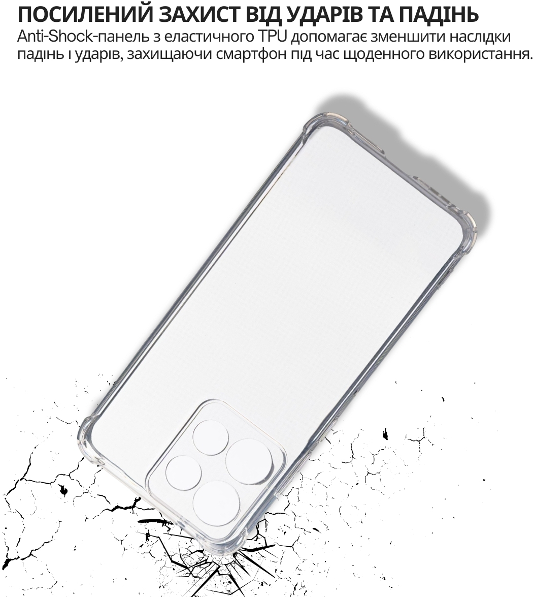 Anti-Shock панель забезпечує захист вашого телефону від падінь, ударів та подряпин. Матеріал TPU є еластичним, що дозволяє панелі адаптуватися до форми вашого смартфону та забезпечує зручний доступ до усіх кнопок та портів.