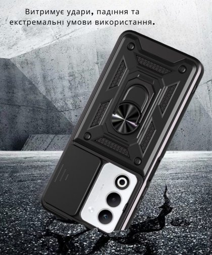 Гнучка силіконова панель має жорсткий металізований корпус та кільце-підставку для пальця. Чохол здатний витримати навіть сильні удари та подряпини.