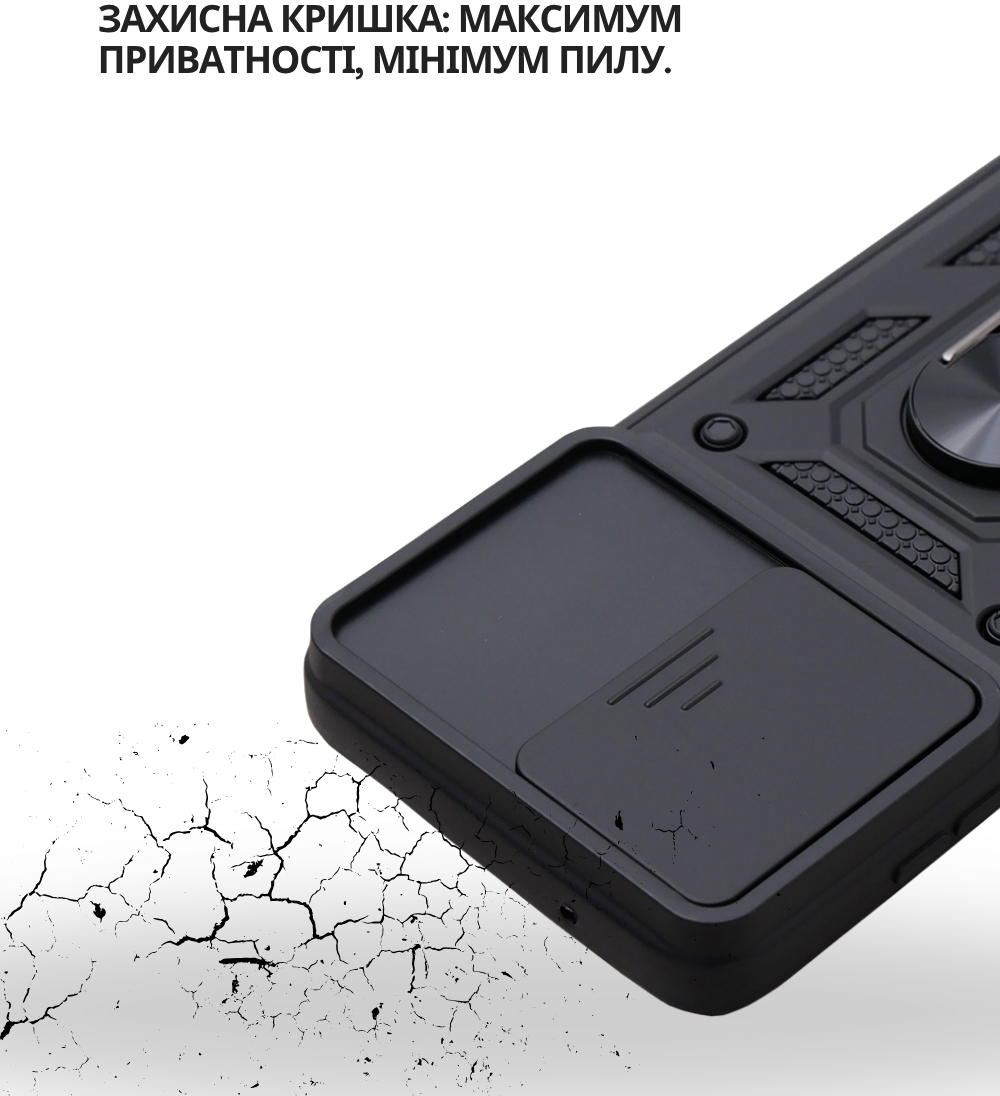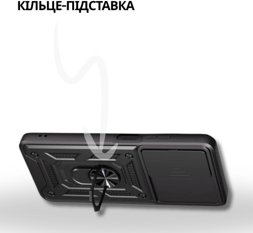 Гнучка силіконова панель має жорсткий металізований корпус та кільце-підставку для пальця. Чохол здатний витримати навіть сильні удари та подряпини.