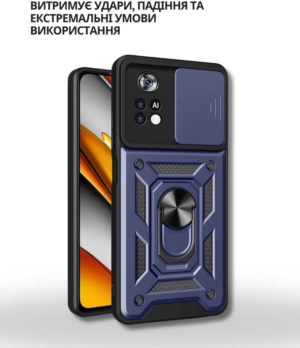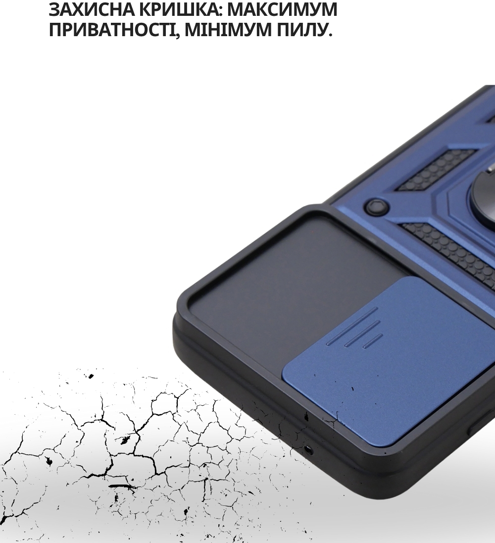 Гнучка силіконова панель має жорсткий металізований корпус та кільце-підставку для пальця. Чохол здатний витримати навіть сильні удари та подряпини.