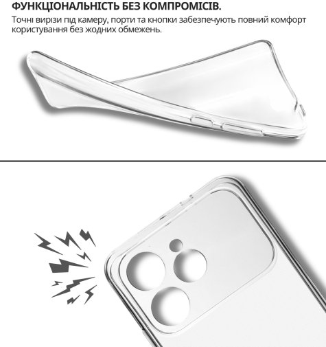 Чохол легко встановлюється, щільно прилягає до поверхні смартфона, не залишаючи повітряних зазорів, які могли б накопичувати пил, бруд або вологу. Легкий і непомітний, він не додає зайвого об'єму чи ваги вашому пристрою, забезпечуючи надійний захист від ударів, пошкоджень і вологи.