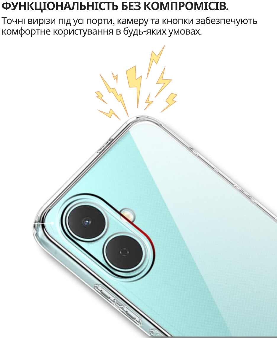 Чохол легко встановлюється, щільно прилягає до поверхні смартфона, не залишаючи повітряних зазорів, які могли б накопичувати пил, бруд або вологу. Легкий і непомітний, він не додає зайвого об'єму чи ваги вашому пристрою, забезпечуючи надійний захист від ударів, пошкоджень і вологи.