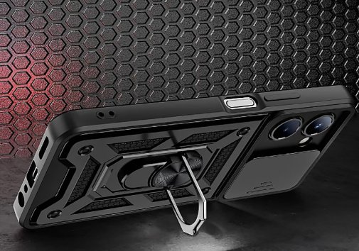 Гнучка силіконова панель має жорсткий металізований корпус та кільце-підставку для пальця. Чохол здатний витримати навіть сильні удари та подряпини.