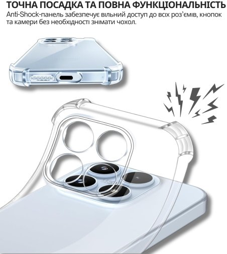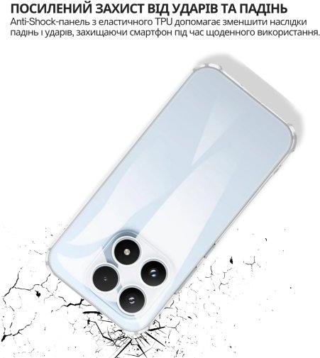 Anti-Shock панель забезпечує захист вашого телефону від падінь, ударів та подряпин. Матеріал TPU є еластичним, що дозволяє панелі адаптуватися до форми вашого смартфона та забезпечує зручний доступ до усіх кнопок та портів.