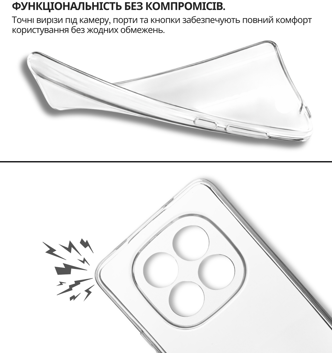 Чохол легко встановлюється, щільно прилягає до поверхні смартфона, не залишаючи повітряних зазорів, які могли б накопичувати пил, бруд або вологу. Легкий і непомітний, він не додає зайвого об'єму чи ваги вашому пристрою, забезпечуючи надійний захист від ударів, пошкоджень і вологи.