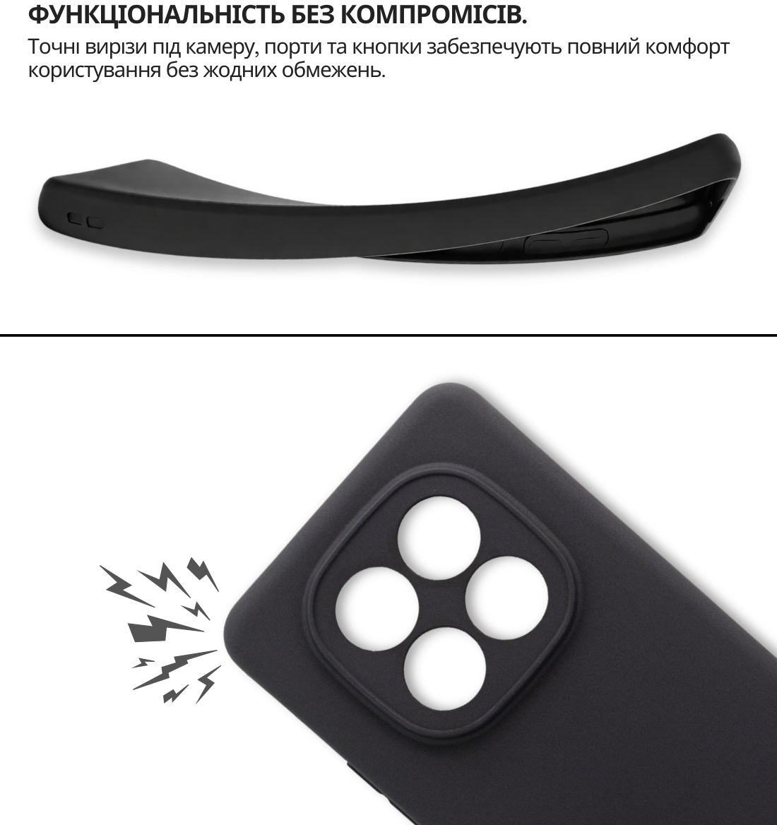 Чохол легко встановлюється, щільно прилягає до поверхні смартфона, не залишаючи повітряних зазорів, які могли б накопичувати пил, бруд або вологу. Легкий і непомітний, він не додає зайвого об'єму чи ваги вашому пристрою, забезпечуючи надійний захист від ударів, пошкоджень і вологи.