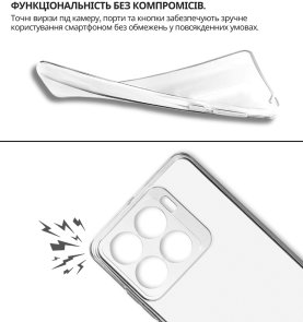 Чохол легко встановлюється, щільно прилягає до поверхні смартфона, не залишаючи повітряних зазорів, які могли б накопичувати пил, бруд або вологу. Легкий і непомітний, він не додає зайвого об'єму чи ваги вашому пристрою, забезпечуючи надійний захист від ударів, пошкоджень і вологи.