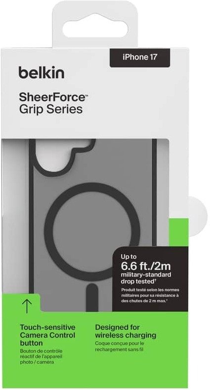 Belkin Grip Series для iPhone 17 (MSA034HQBK, Black) — класичний магнітний чохол у чорному кольорі з протиковзною текстурою, захистом від падінь до 2 м і повною сумісністю з MagSafe. Тонкий корпус із TPU (з перероблених матеріалів), вигнуті краї, поліровані кнопки та напівпрозоре покриття з м’яким фінішем. Ідеальний баланс естетики, комфорту й надійності — універсальний вибір для будь-якого стилю.