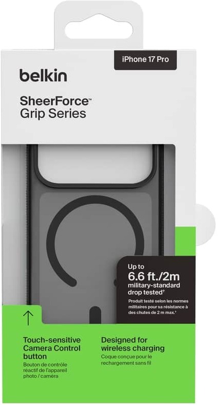 Belkin Grip Series для iPhone 17 Pro (MSA035HQBK, Black) — класичний магнітний чохол у чорному кольорі з протиковзною текстурою, захистом від падінь до 2 м і повною сумісністю з MagSafe. Тонкий корпус із TPU (з перероблених матеріалів), вигнуті краї, поліровані кнопки та напівпрозоре покриття з м’яким фінішем. Ідеальний баланс естетики, комфорту й надійності — універсальний вибір для будь-якого стилю.