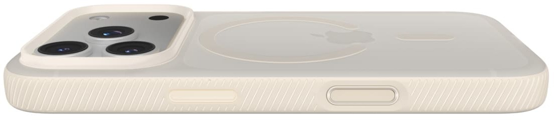 Протиковзний текстурований бампер гарантує надійне утримання однією рукою — навіть у русі. Вигнуті краї виступають над екраном і камерою, запобігаючи подряпинам при контакті з поверхнею. Поліровані кнопки (гучність, живлення, Action Button) зберігають природну чутливість натискання, а сенсорна кнопка камери дозволяє миттєво активувати зйомку. Прозоре покриття стійке до пожовтіння, подряпин і відбитків — зберігає кришталеву чистоту роками.