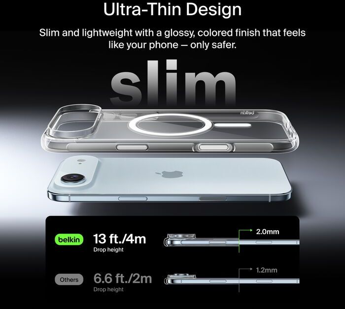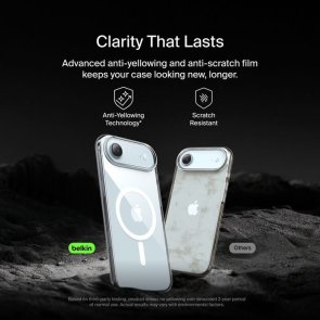 Чохол Belkin Clear Series (MSA033HQCL, прозорий) — максимально прозорий захист для iPhone Air, що зберігає оригінальний дизайн смартфона. Комбінація термопластичного поліуретану (TPU) і полікарбонату (PC) забезпечує міцність і гнучкість. Захист від падінь до 4 м, протиковзний бампер і вигнуті краї для екрану та камери.