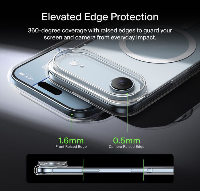 Сумісний із MagSafe — бездротова зарядка та аксесуари без знімання. Поліровані кнопки зберігають чутливість, сенсорна кнопка камери — точність. Прозоре покриття стійке до пожовтіння та подряпин. Виготовлений із перероблених матеріалів — екологічний вибір.