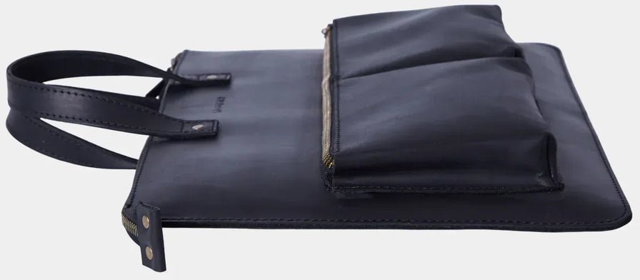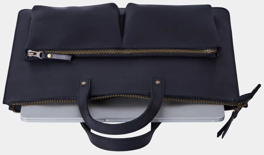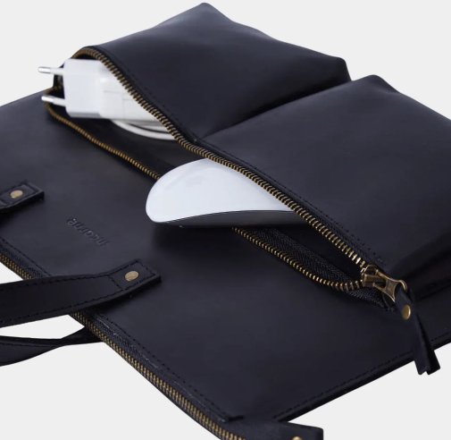 Зовні чохол виглядає лаконічно: рівні лінії, стримана форма, вінтажна фактура натуральної шкіри, яка з часом набуває власного характеру. Такий виріб однаково органічно вписується в чоловічий і жіночий стиль — дизайн Brave свідомо універсальний. На лицевій панелі розміщені дві місткі кишені для аксесуарів: миші, блока живлення, дротів, невеликих документів чи всього, що потрібно мати під рукою, не відкриваючи основний відсік.