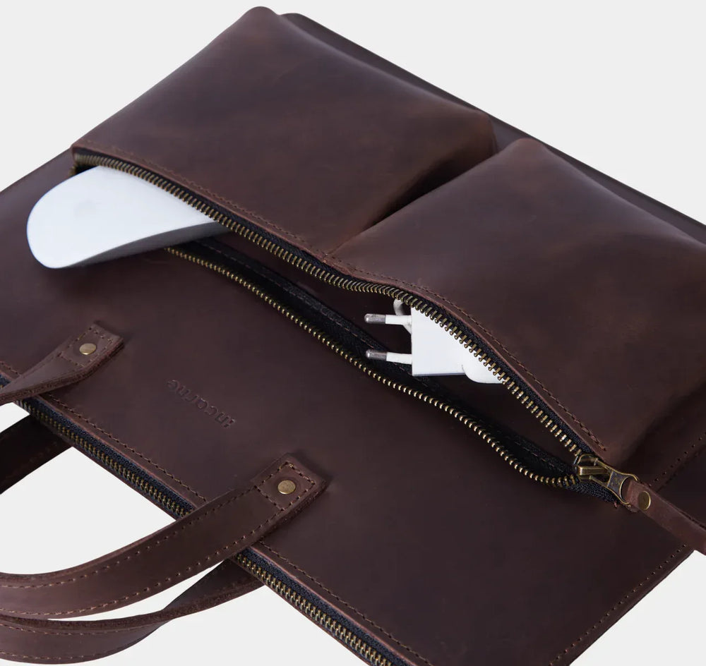 Зовні чохол виглядає лаконічно: рівні лінії, стримана форма, вінтажна фактура натуральної шкіри, яка з часом набуває власного характеру. Такий виріб однаково органічно вписується в чоловічий і жіночий стиль — дизайн Brave свідомо універсальний. На лицевій панелі розміщені дві місткі кишені для аксесуарів: миші, блока живлення, дротів, невеликих документів чи всього, що потрібно мати під рукою, не відкриваючи основний відсік.