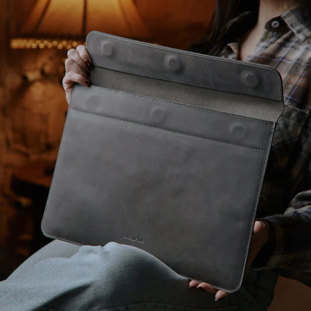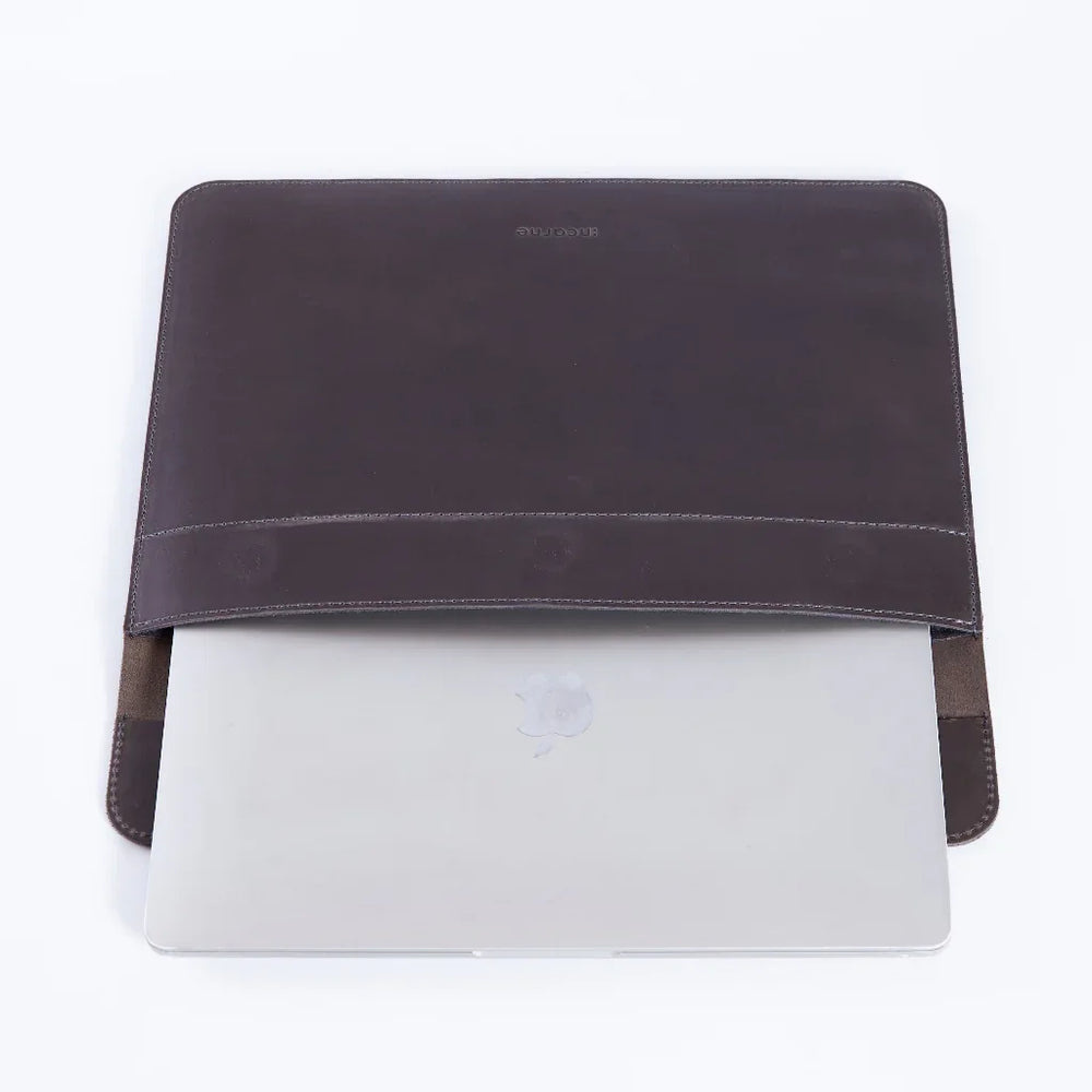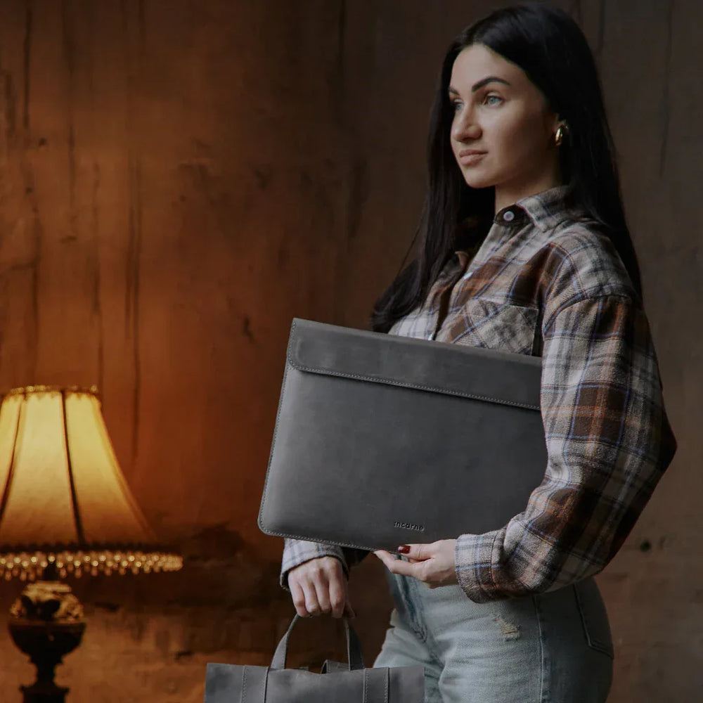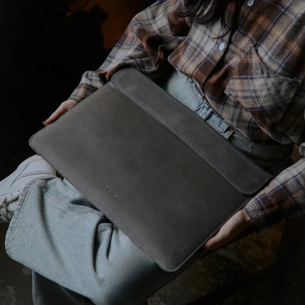 INCARNE Klouz — стильний шкіряний чохол для ноутбука. Виготовлений з натуральної шкіри Crazy Horse. Шкіра відома у всьому світі своєю вінтажною естетикою, міцністю та довговічністю. Вона легко дряпається та затирається, завдяки чому отримує особливий шарм, змінюючи свій відтінок на кожній складці та подряпині. Здатність зберігати такий «ретро» стиль є ексклюзивною для сумок та чохлів зі шкіри Crazy Horse.