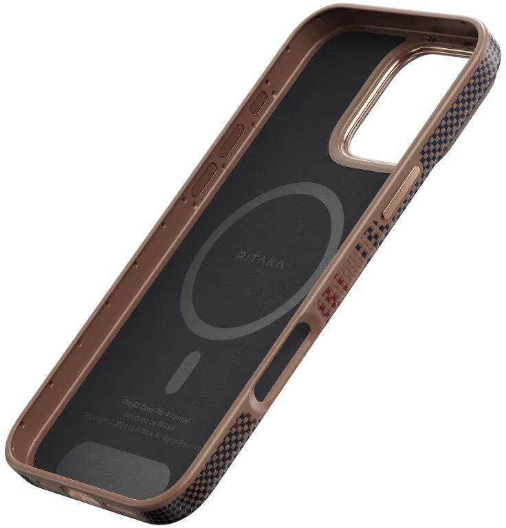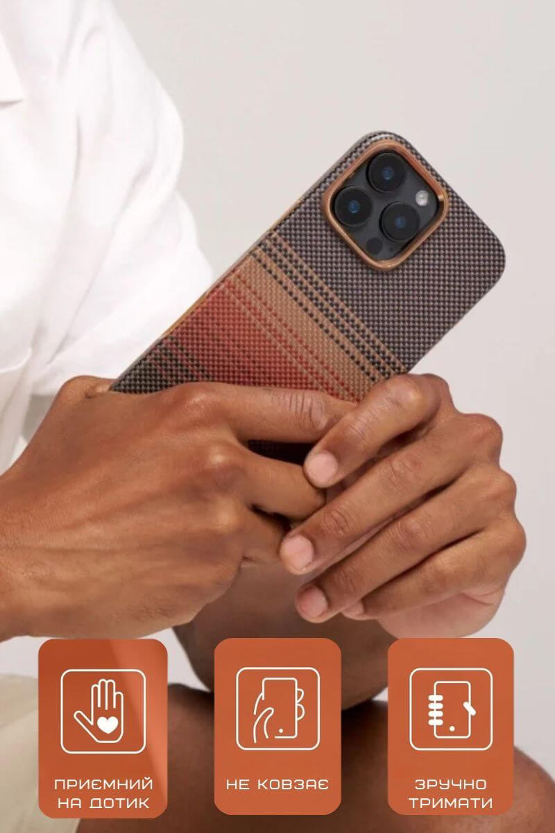 Pitaka Military-Grade Protective Case Classic Twill 600D виготовлений з арамідного волокна — того самого матеріалу, що відомий у народі як кевлар. Чохол пройшов випробування за військовим стандартом захисту від ударів: підсилені кути та багатошарова конструкція амортизують падіння на тверду поверхню, надійно захищаючи корпус і камеру від пошкоджень. При цьому товщина виробу складає лише 0,75 мм, а сам чохол практично не додає ваги — телефон залишається таким же тонким і зручним у руці, яким його задумали в Apple.