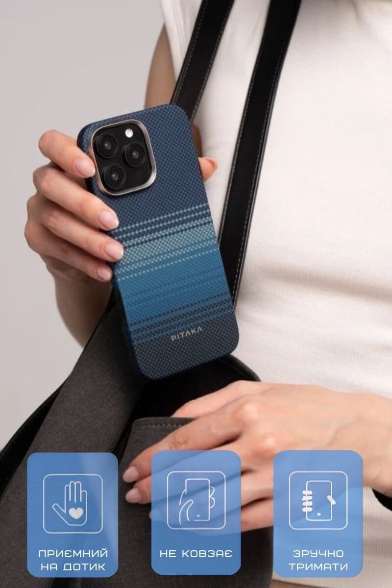 Основу конструкції становить арамідне волокно — надміцний матеріал, що використовується в аерокосмічній та оборонній промисловості. Завдяки цьому чохол є надзвичайно легким, але водночас стійким до ударів, подряпин і зношування. Він не вицвітає, не деформується та зберігає первинний вигляд навіть після тривалого щоденного використання.