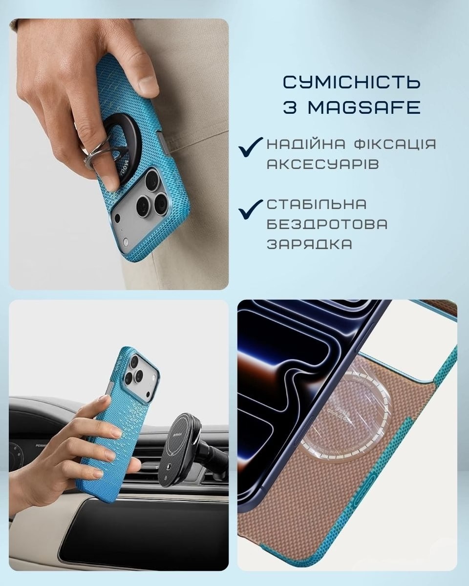 Інтегровані магніти MagSafe забезпечують безшовну роботу з бездротовою зарядкою, гаманцями чи аксесуарами, фіксуючи їх міцно без прослизання, а підняті краї захищають екран і камери від контакту з поверхнями, роблячи чохол практичним для повсякденного носіння в кишені чи сумці.