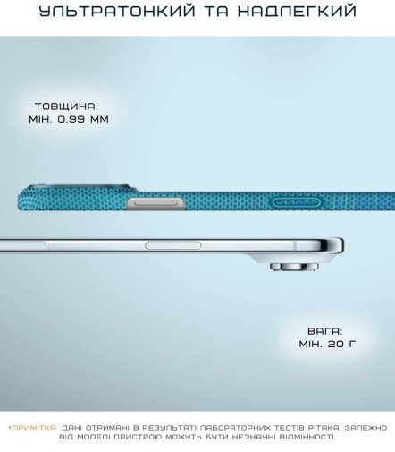 Виготовлений з арамідного волокна, чохол має тканинну текстуру, що надає преміумвідчуття на дотик. Вона стійка до подряпин і відбитків пальців, ніби м'яка оболонка, що обіймає пристрій, зберігаючи його оригінальні лінії без зайвого об'єму — товщина всього 2 мм і вага близько 36 г роблять його майже непомітним, дозволяючи насолоджуватися природним відчуттям iPhone, ніби ви тримаєте його без чохла, але з впевненістю в щоденній безпеці.