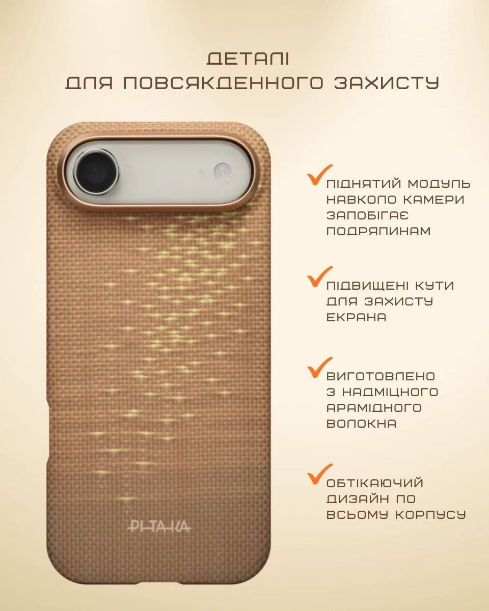 Виготовлений з арамідного волокна, чохол має тканинну текстуру, що надає преміумвідчуття на дотик. Вона стійка до подряпин і відбитків пальців, ніби м'яка оболонка, що обіймає пристрій, зберігаючи його оригінальні лінії без зайвого об'єму — товщина всього 1.182 мм і вага близько 21 г роблять його майже непомітним, дозволяючи насолоджуватися природним відчуттям iPhone, ніби ви тримаєте його без чохла, але з впевненістю в щоденній безпеці.