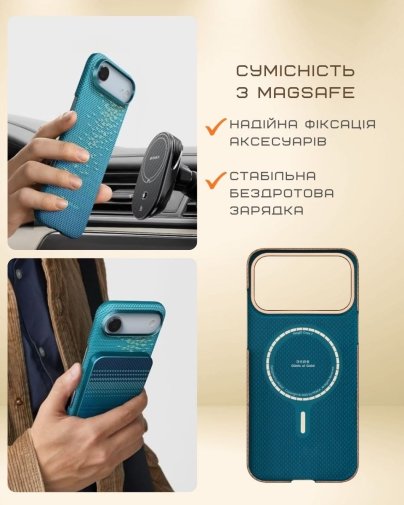 Інтегровані магніти MagSafe забезпечують безшовну роботу з бездротовою зарядкою, гаманцями чи аксесуарами, фіксуючи їх міцно без прослизання, а підняті краї захищають екран і камери від контакту з поверхнями, роблячи чохол практичним для повсякденного носіння в кишені чи сумці.